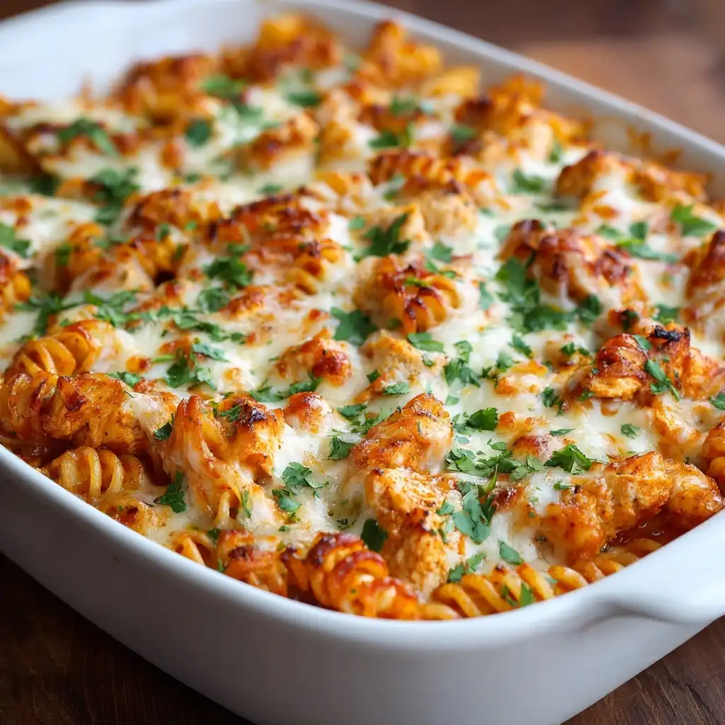 • Buffalo Chicken Parmesan Casserole: Toss cooked chicken in ⅓ cup Buffalo sauce before layering. Mix 2 tbsp blue cheese crumbles into the ricotta. Top with extra blue cheese and a swirl of ranch or blue cheese dressing after baking.